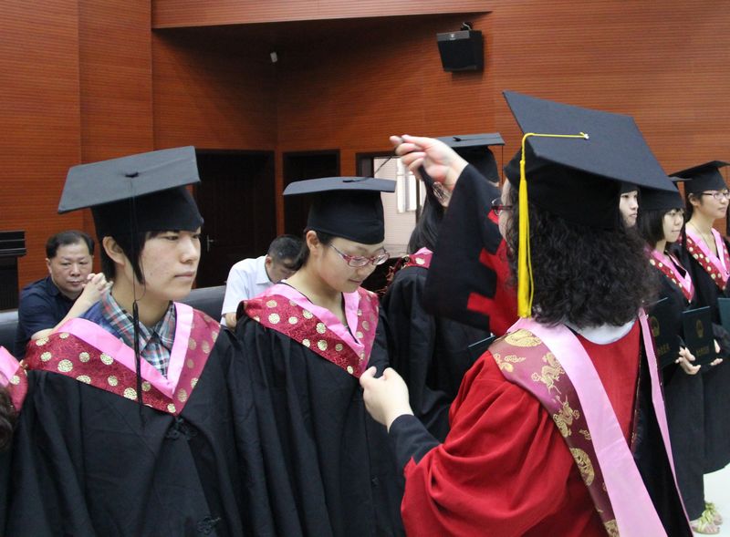 典礼在庄严的国歌中开始。首先由郑辉副教授宣读学位授予决定。随后院长刘丹冰教授为每一位学子拨穗正冠,并颁发学位证书。