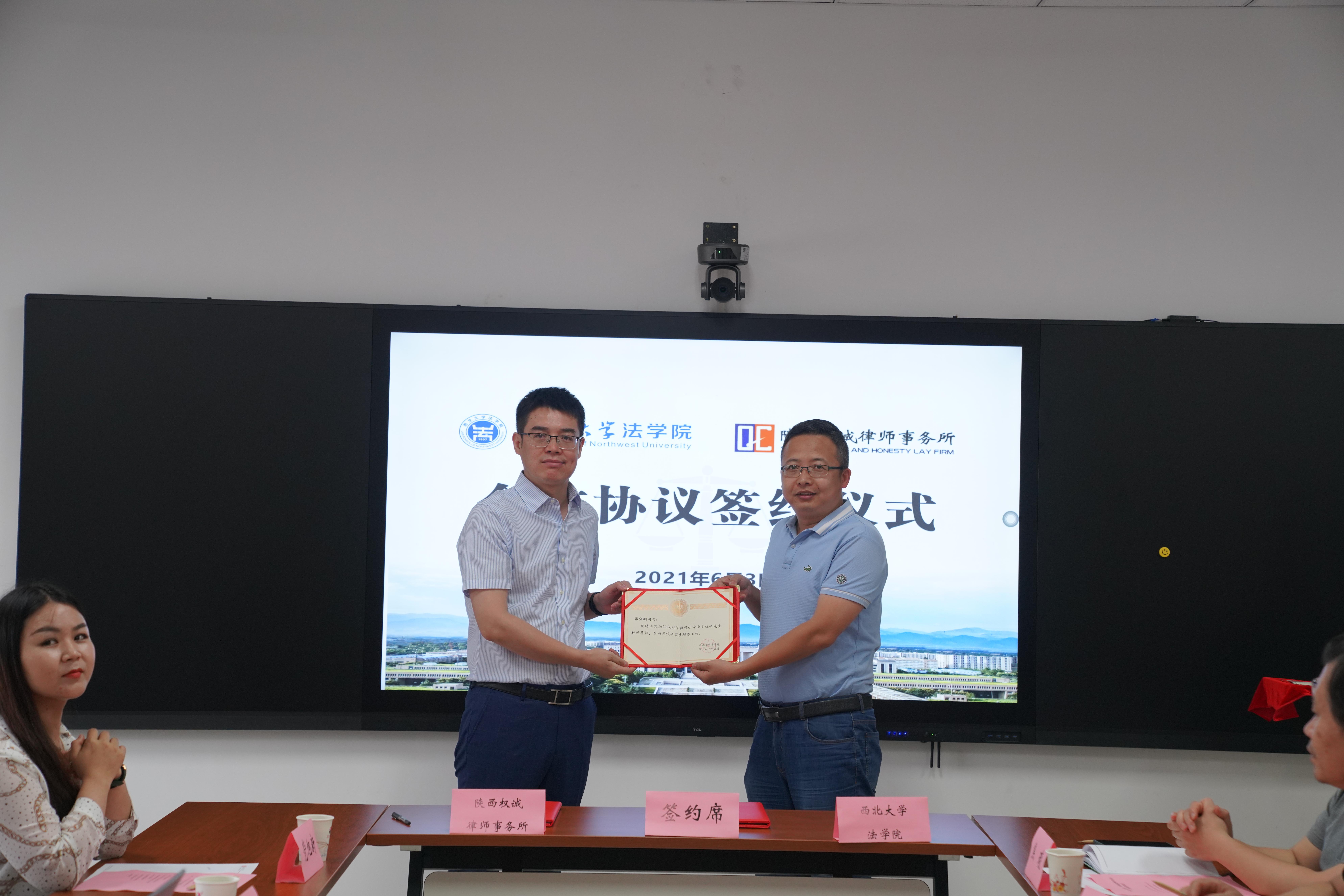 王思锋院长与李丹主任代表双方单位签署了合作协议。学院环境与资源保护法学教研部主任王社坤教授和陕西权诚律师事务所副主任张宝刚律师共同为实践教学基地揭牌。学院副院长代水平向陕西权诚律师事务所主任李丹、副主任张宝刚和高级合伙人梅杰颁发了法律硕士实务导师聘书。梅杰律师代表法律硕士实务导师作了发言,表示未来一定按照学院的要求,参与服务于学院研究生培养工作。